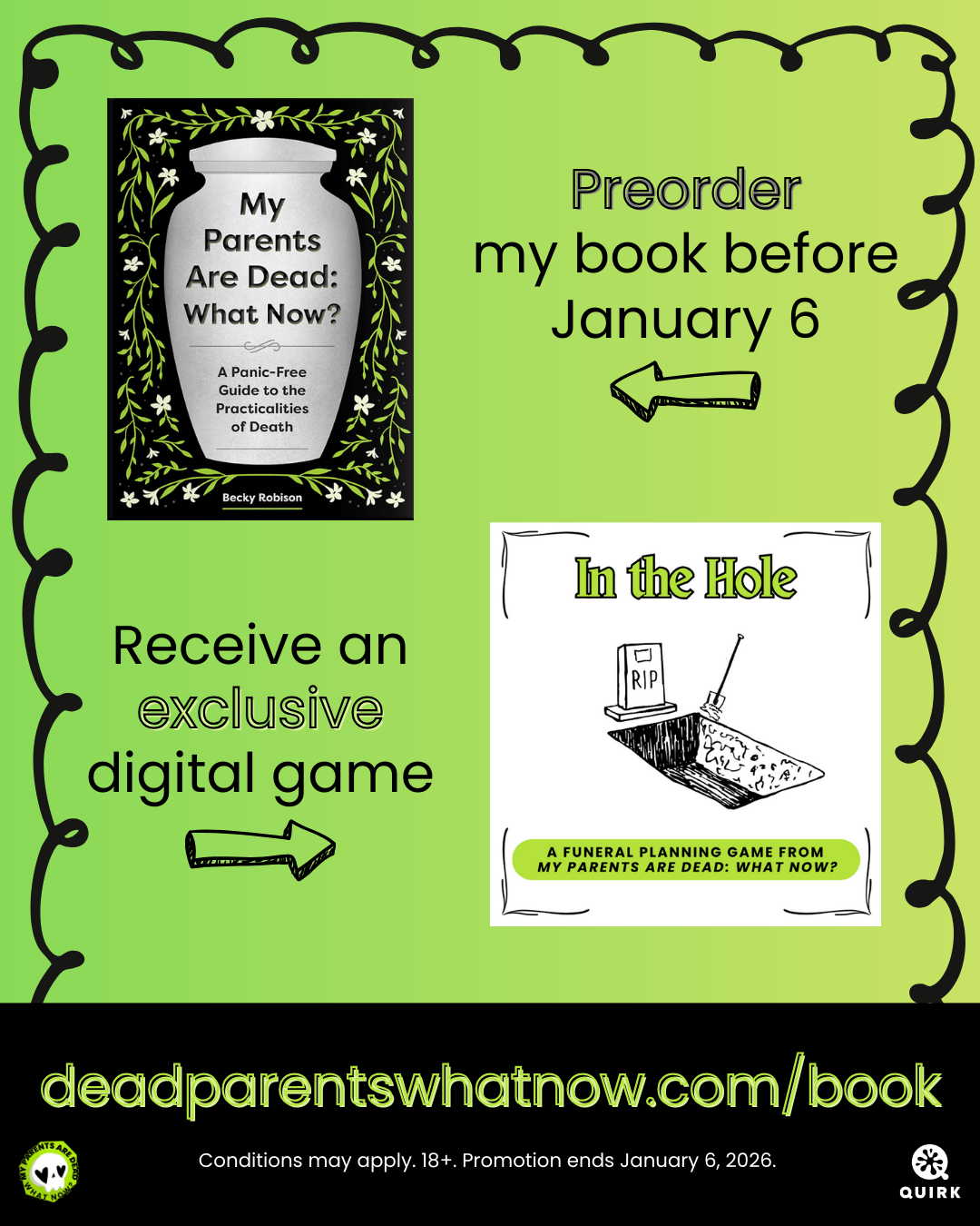 My Parents Are Dead: What Now? A Panic-Free Guide to the Practicalities of Death is coming out on January 6, 2026. That’s only six weeks!